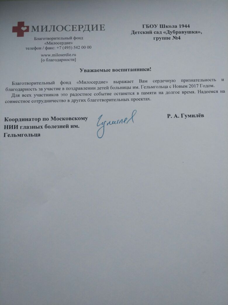 Коллектив родителей средней группы номер 4 д/с Дубравушка сердечно благодарит воспитателей Тамонис Елену Владимировну и Якунину Елену Сергеевну за создание проекта "Добро" и непосредственное участие в нем, в рамках которого мы смогли поздравить с Новым 2017 годом детей больницы глазных болезней им.Гельмгольца! Спасибо вам за то,что прививаете нашим детям такие качества как:доброта и милосердие.